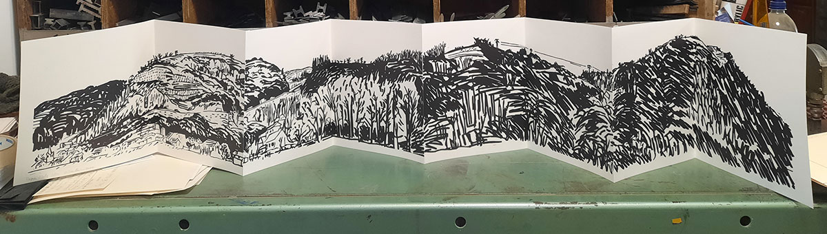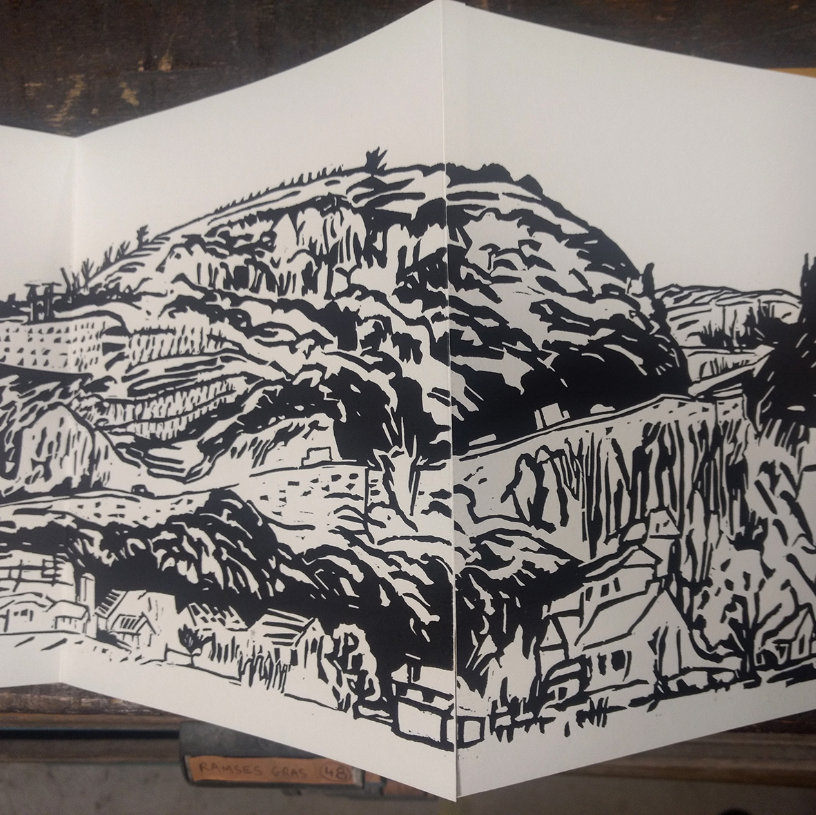 "Depuis Moly", 176 x 22,5 cm ouvert, 22 x 22,5 cm sous coffret typographique. Impresssion en une couleur (noire) sur papier Fedrigoni, 20 exemplaires numérotés/signés, 40 €, à commander via eldrawdraw@gmail.com. Cette estampe date de décembre 2022, mais je n'avais pas trouvé le temps d'en causer ici, c'est chose faite.