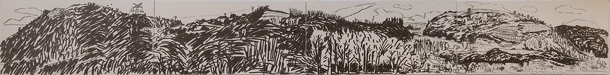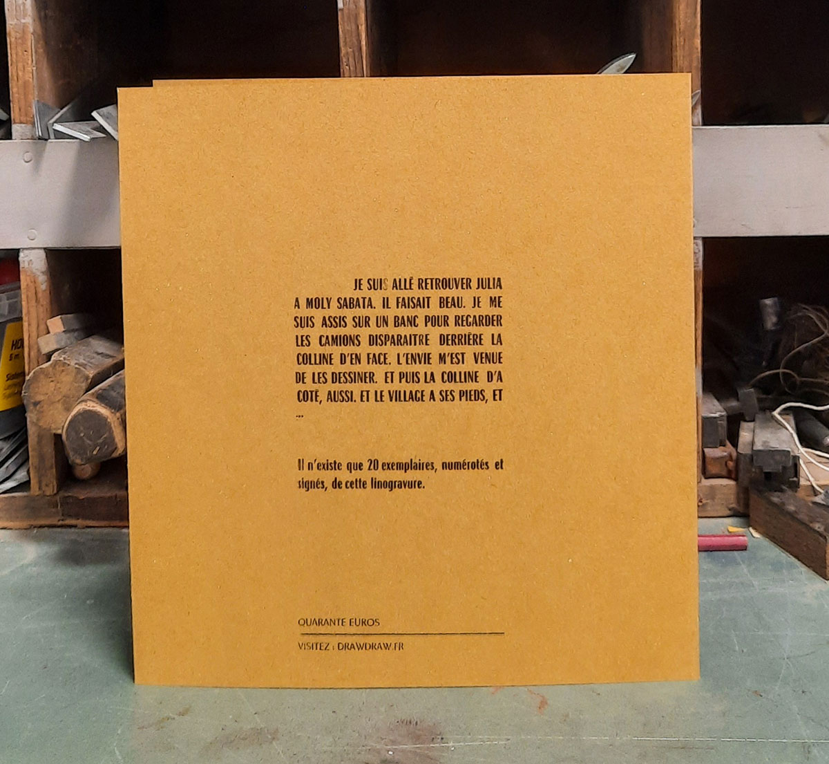 Or, depuis l'arrière du bâtiment de la résidence, le long du canal, on a une vue sur la rive d'en face, avec le mont Pilat en ligne de mire. J'ai passé un moment sur un banc, bien au soleil, à regarder les camions passer au loin, comme des jouets d'enfant sur une maquette. Et j'ai commencé à dessiner sur mes plaques de lino.