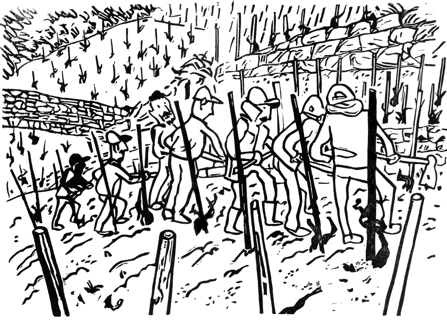Une des premières images que j'ai dessiné, c'était au mois d'avril 2024. Il faisait très chaud, on était en plein Ramadan. Et toute une équipe de marocains piochaient la terre des coteaux. Alors qu'ils ne s'autorisaient pas à boire une goutte d'eau, on entendaient des glou-glou roucouler de toutes part, les cours d'eau alentours étant bien remplis à cette saison. Au moment où je dessinais les gars, l'un deux s'est retourné pour voir un peu ce que je fabriquais dans leurs dos, et j'ai eu le temps de saisir son coup d'œil d'un geste. C'est un des bons souvenirs que je garde de cette belle expérience.