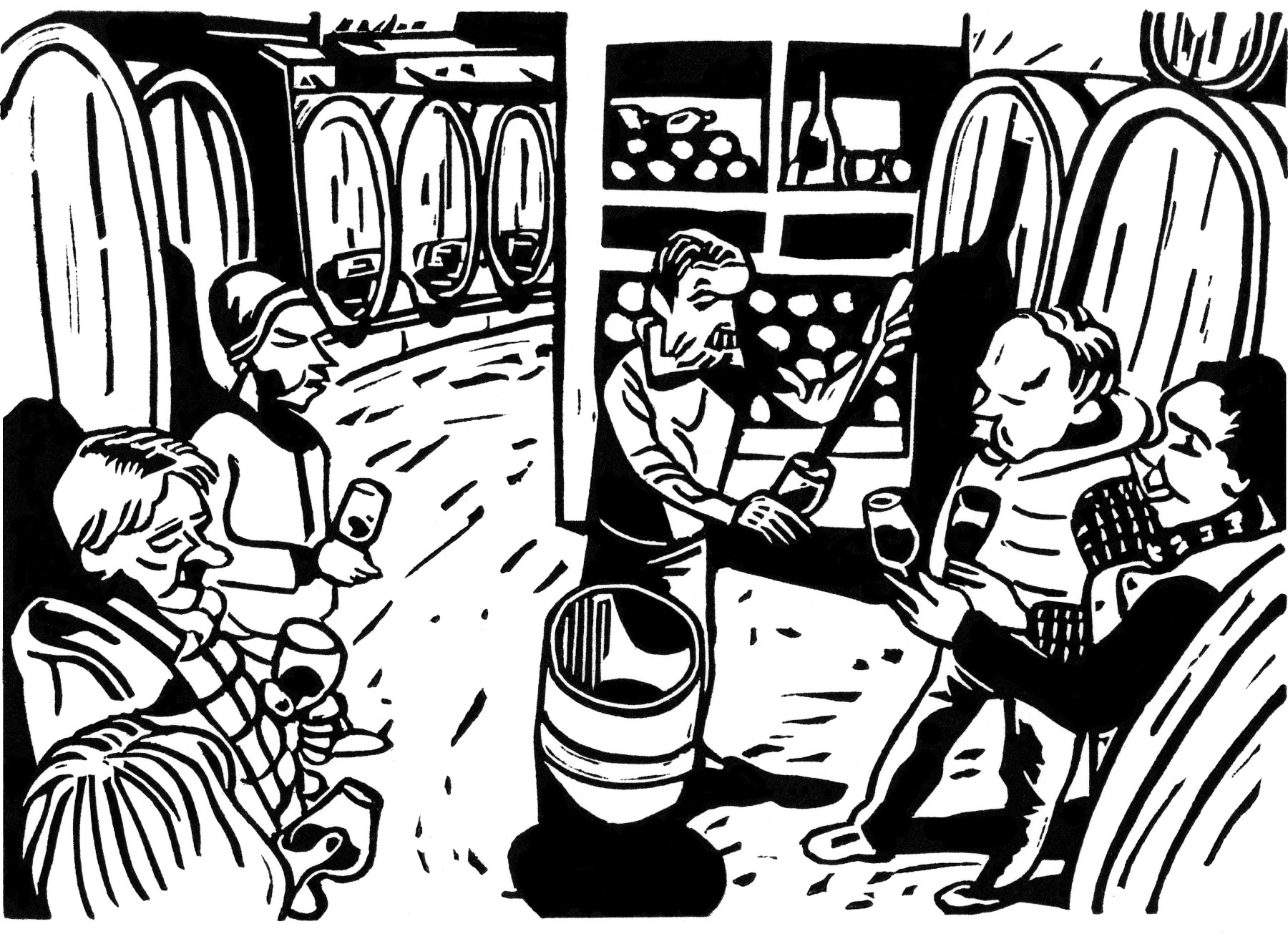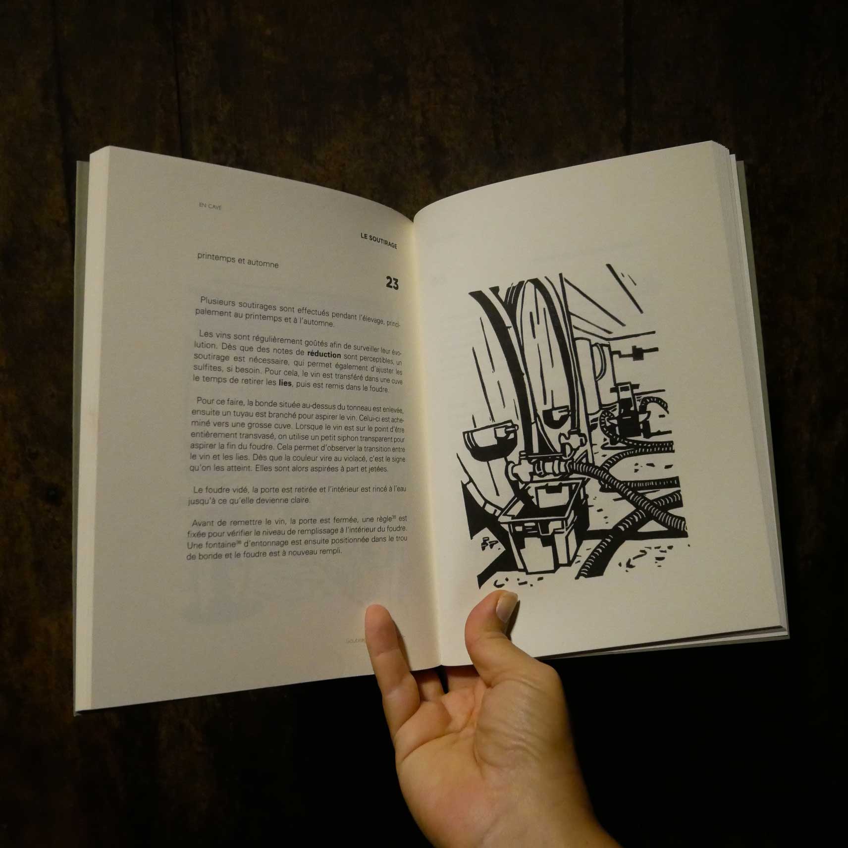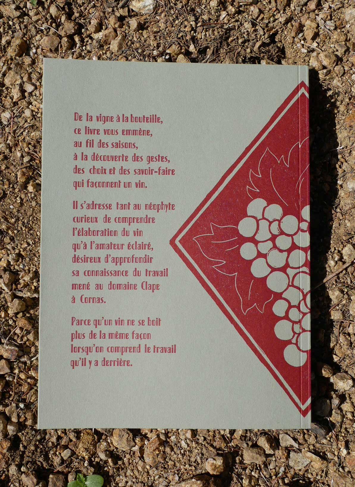 J'ai rencontré Magali Jacob et son compagnon Olivier Clape il y a quelques années. Magali tenait alors un café-librairie à St-Perray (07) et elle avait eu la gentillesse de présenter mon travail de graveur et d'éditeur. Peu à peu, l'idée d'écrire un livre décrivant avec précision les nombreuses étapes nécessaires à l'élaboration d'un vin, celui du domaine Clape qu'Olivier dirigeait avec son père, lui est apparue nécessaire. Nous avons donc convenu d'un "protocole" simple : chaque mois, durant une année, je viendrai dessiner puis graver une image correspondant au travail en cours. Bien sûr, les choses n'ont pas été aussi simple, mais en gros, cette idée nous a servie de fil conducteur pour la composition du livre. D'un côté, Magali livrait bataille avec Olivier et son père pour obtenir des descriptions précises mais compréhensibles par le commun des mortels (elle-même au premier chef), d'un autre, je tentais d'établir une mise en page aussi claire que ces informations. Et des linogravures, donc.